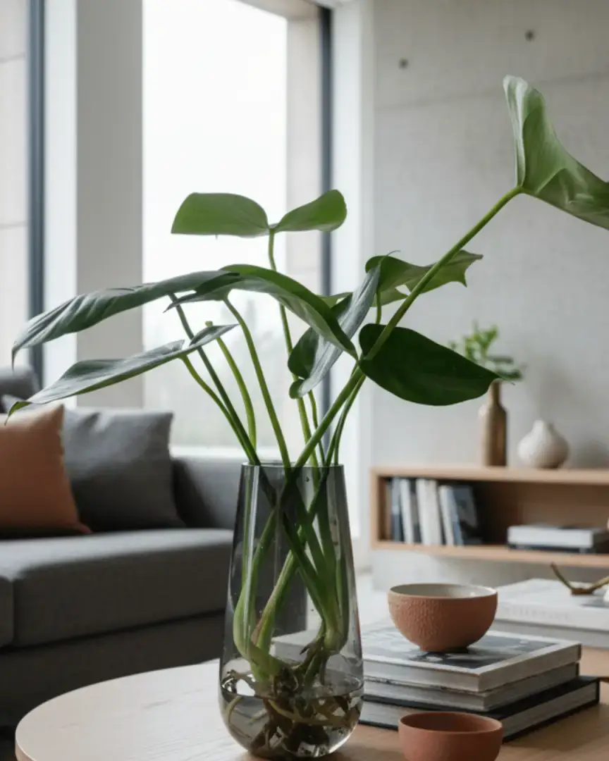 מונסטרות הידרופוניות, באגרטל זכוכית פתוח. גובה האגרטל 24 סמ, גובה הזר יחד עם האגרטל 50-70 ס"מ.