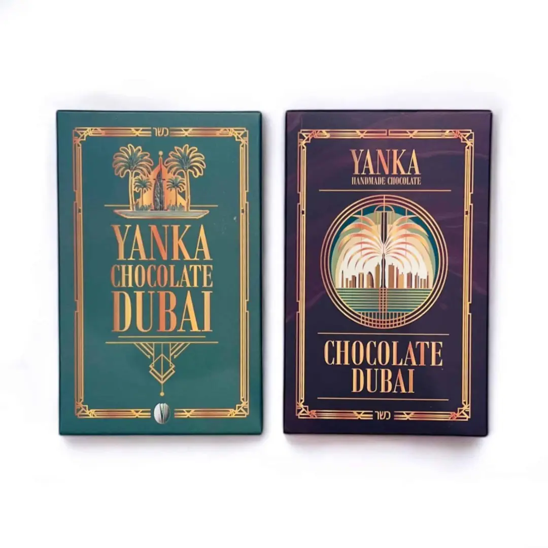 שוקולד דובאי בעבודת יד מבית יאנקה שוקולד, עם שילוב יוצא דופן של שערות קדאיף, לוטוס ופיסטוקים.מיוצר מרכיבים טבעיים בלבד, תוך שימוש בשוקולד בלגי איכותי ומחית פיסטוק שנטחנת במקום בשיטה המסורתית. ללא צבעי מאכל