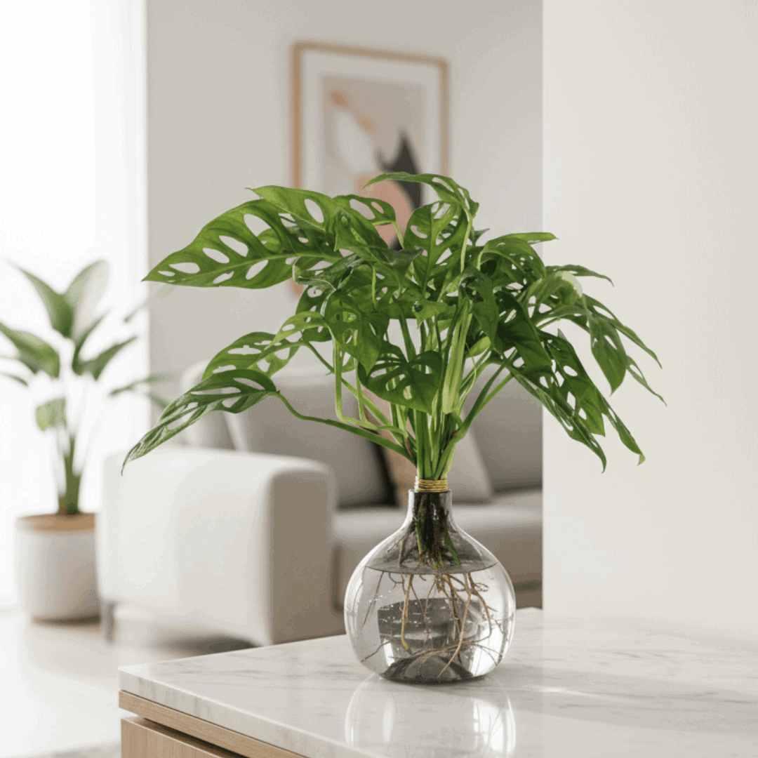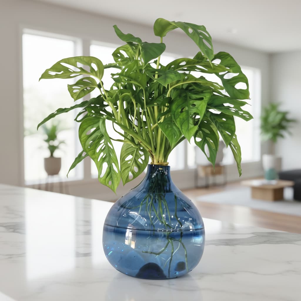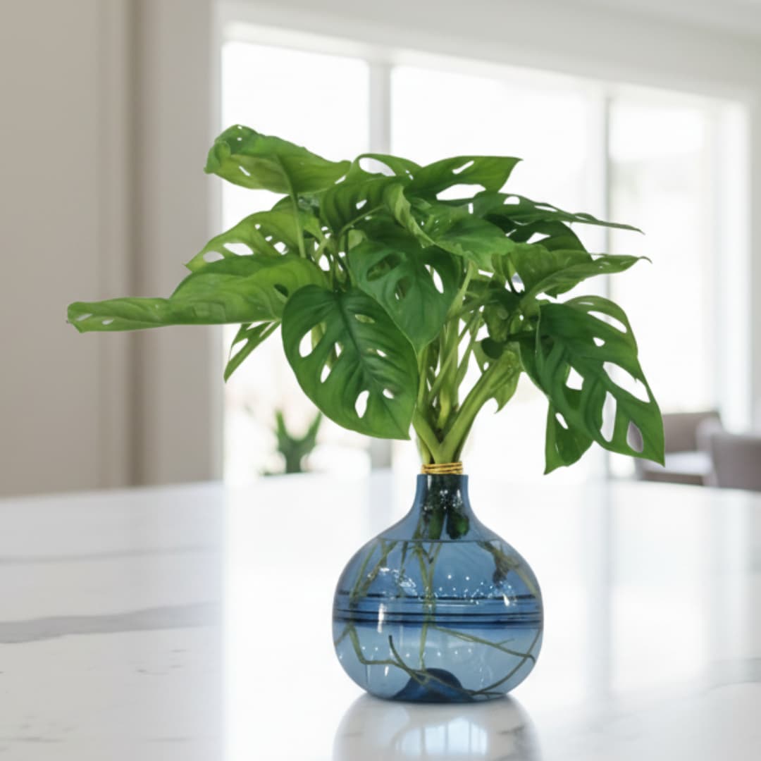 זר מונסטרה מאנקי הידרופוני באגרטל זכוכית בועה שקוף בעל גוון אפור עדין – מתנה ייחודית ויוצאת דופן.